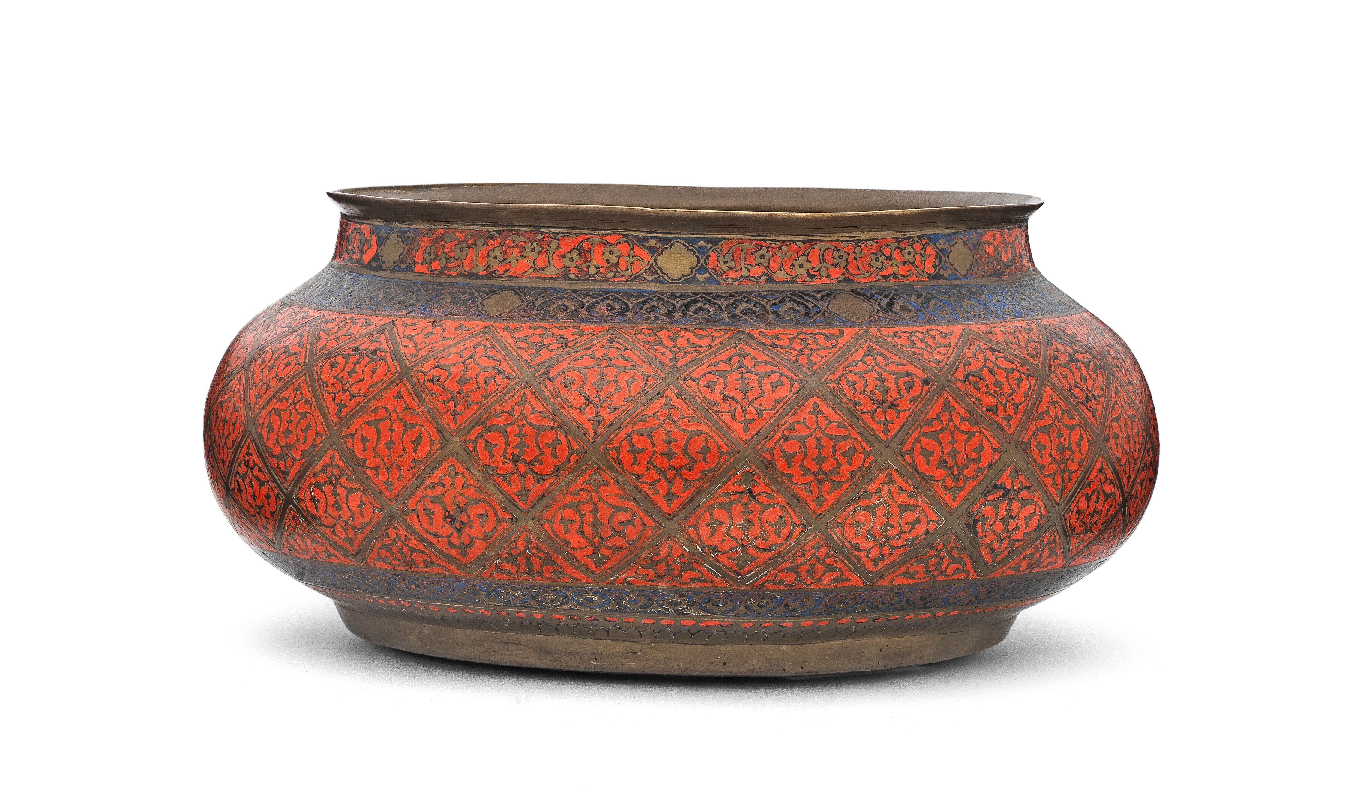 A RARE SAFAVID ENAMELLED BRASS BOWL, PERSIA, 16TH - 17TH CENTURY