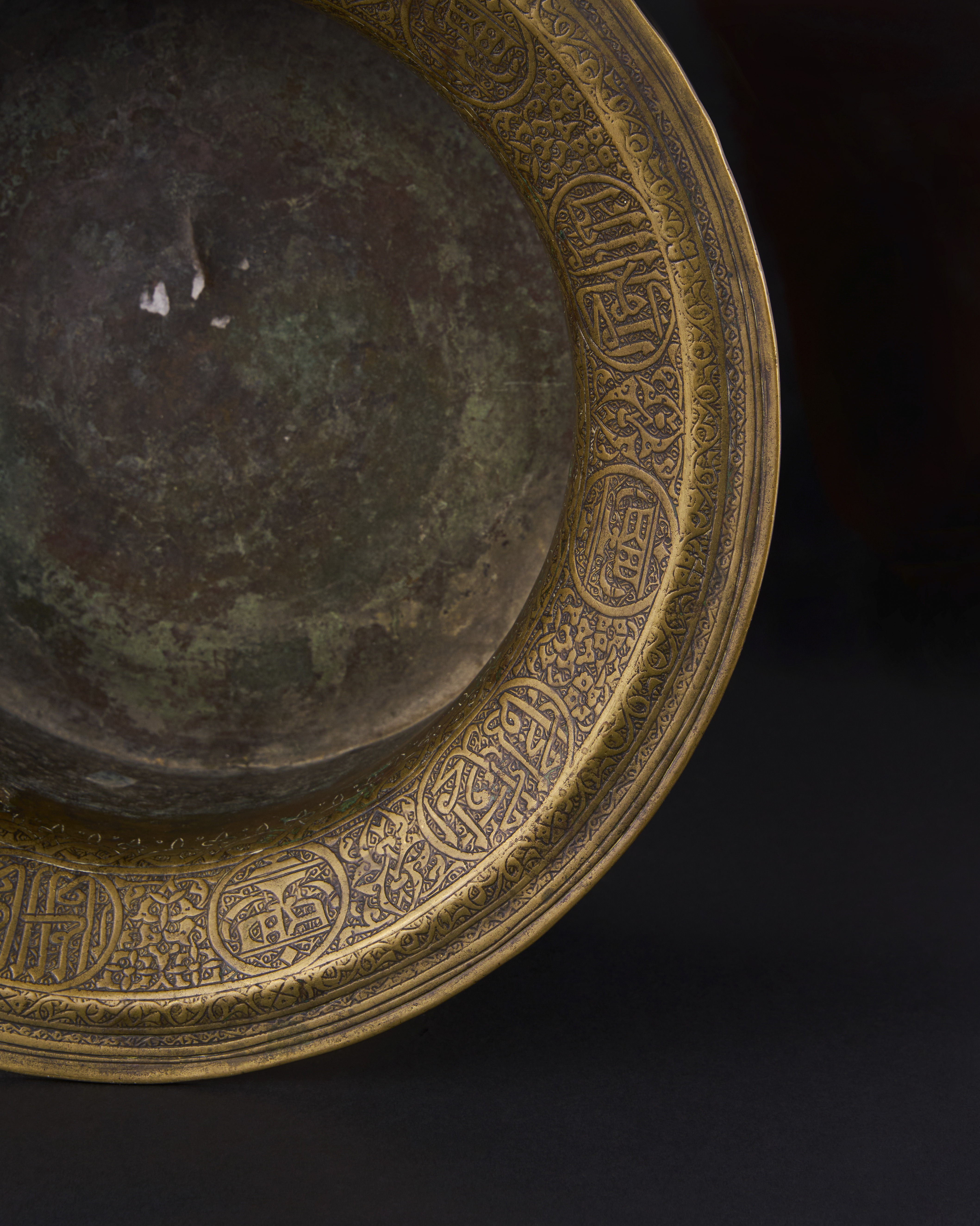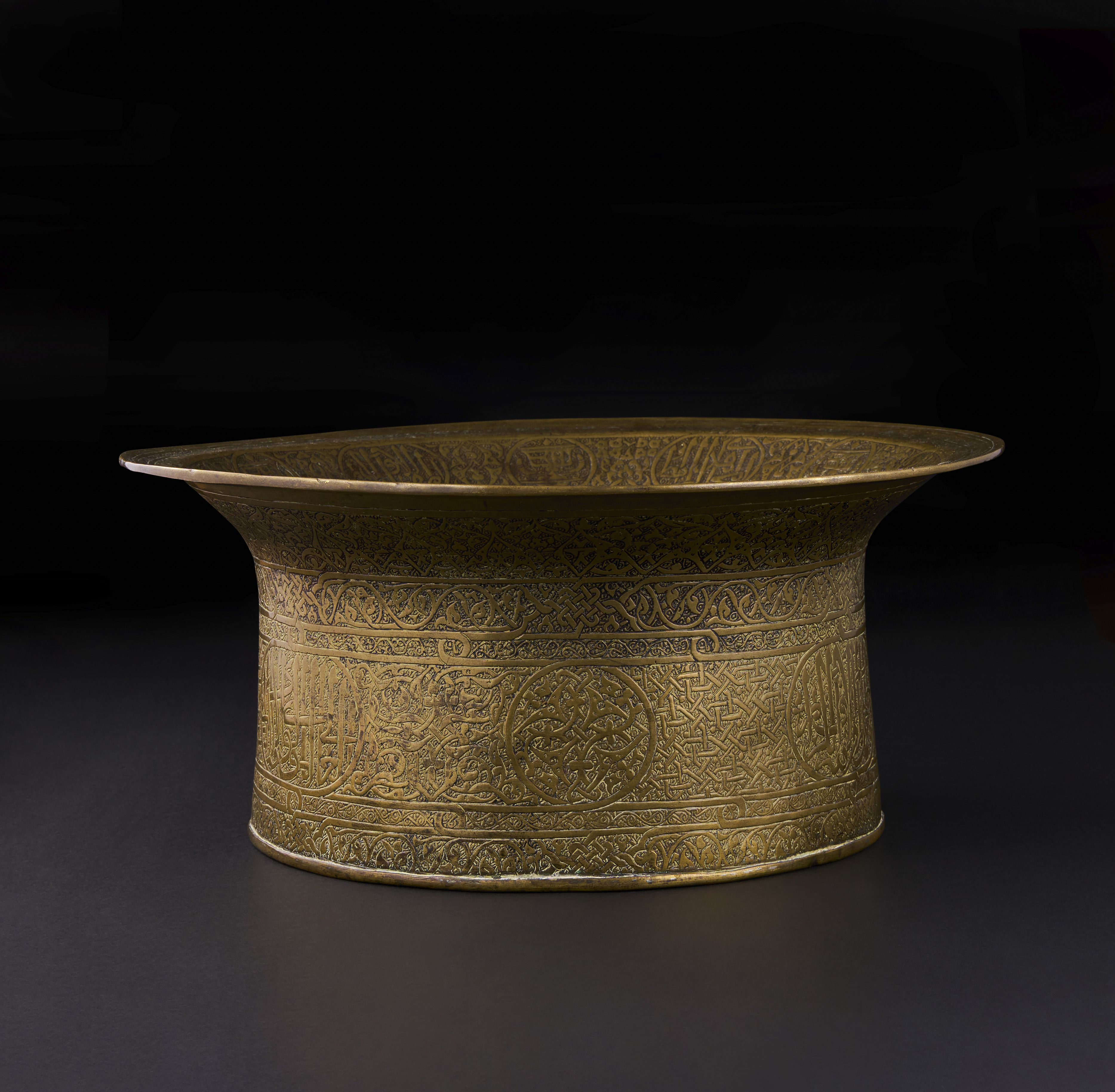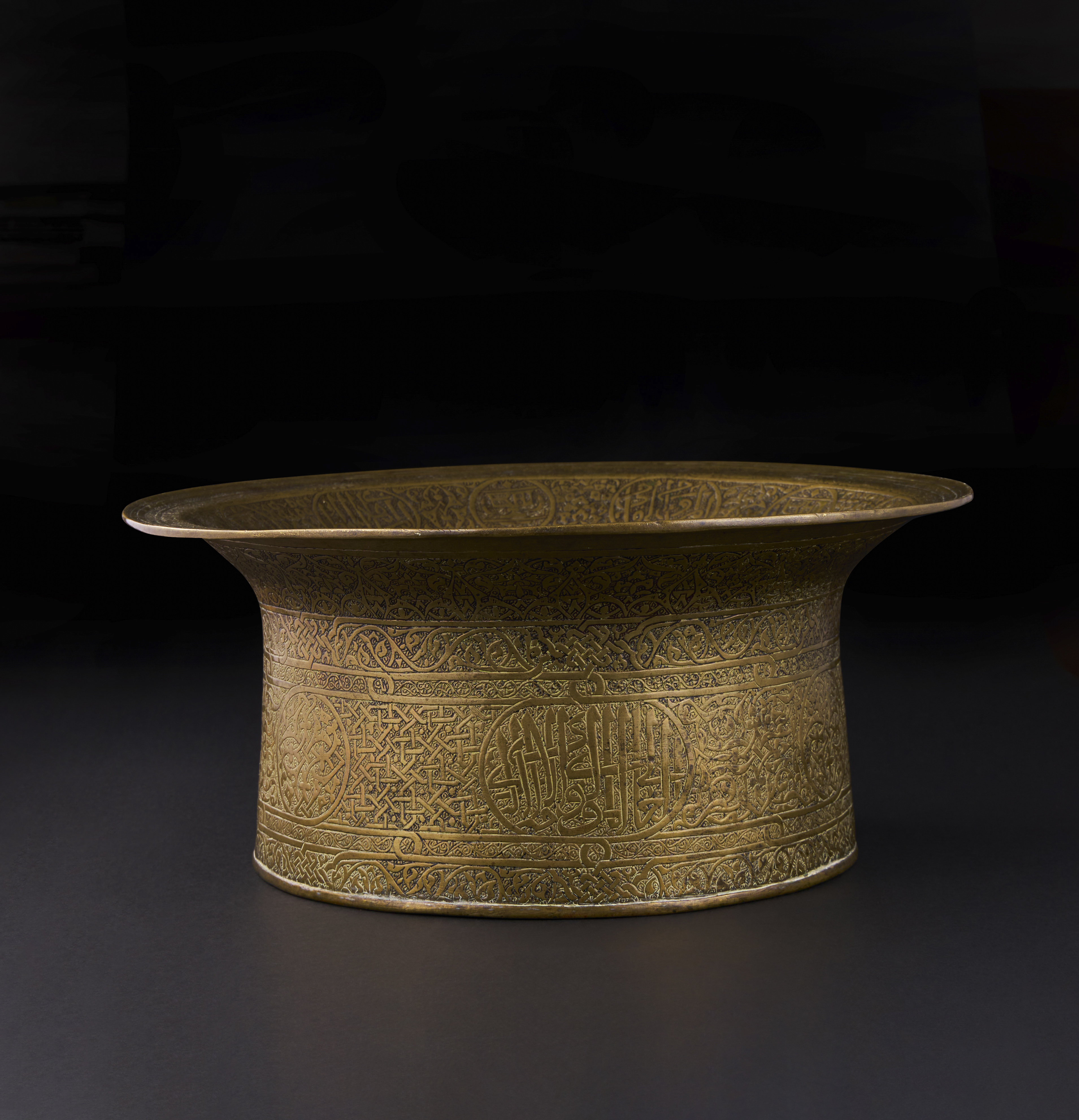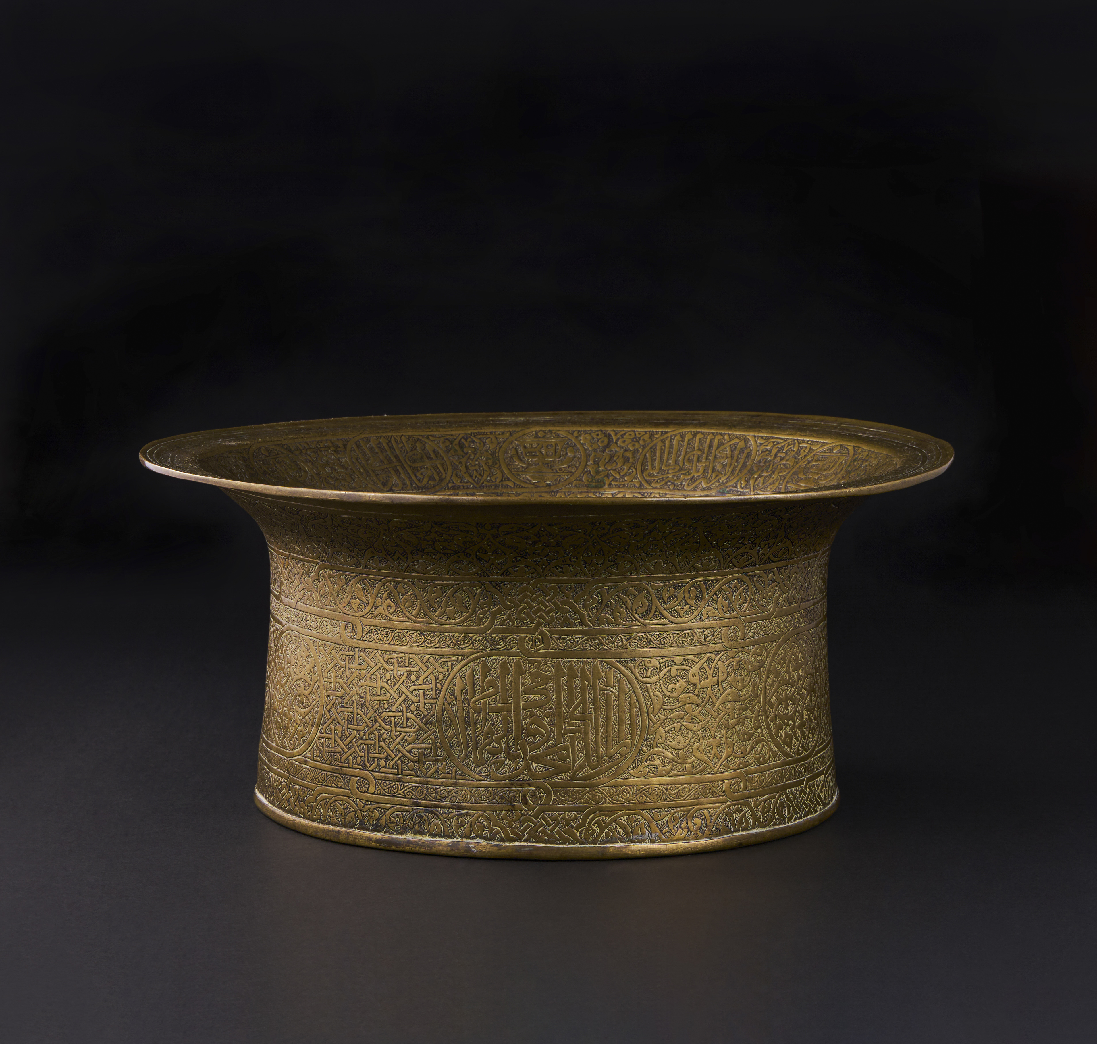 Inscriptions: to the body mimma 'umila bi-rasm al-maqarr al-ashraf al-karim/al-'ali al-mawlawi al-amiri ... /al-maliki al-makhdumi al-humami al-a/, 'One of what was made for the noble authority, the honourable, the high, the lordly, the commander ... the possessing, the masterful, the valiant'; to the rim al-maqarr al-ashraf al-karim / al-'ali al-mawlawi / al-amiri al-kabiri al-maliki / al-'alimi al-'amili a / al-makhdumi al-humami / al-mujahidi al-murabit[i], 'The honourable authority, the high, the lordly, the great commander, the possessing, the learned, the diligent, the masterful, the holy warrior, the defender'.