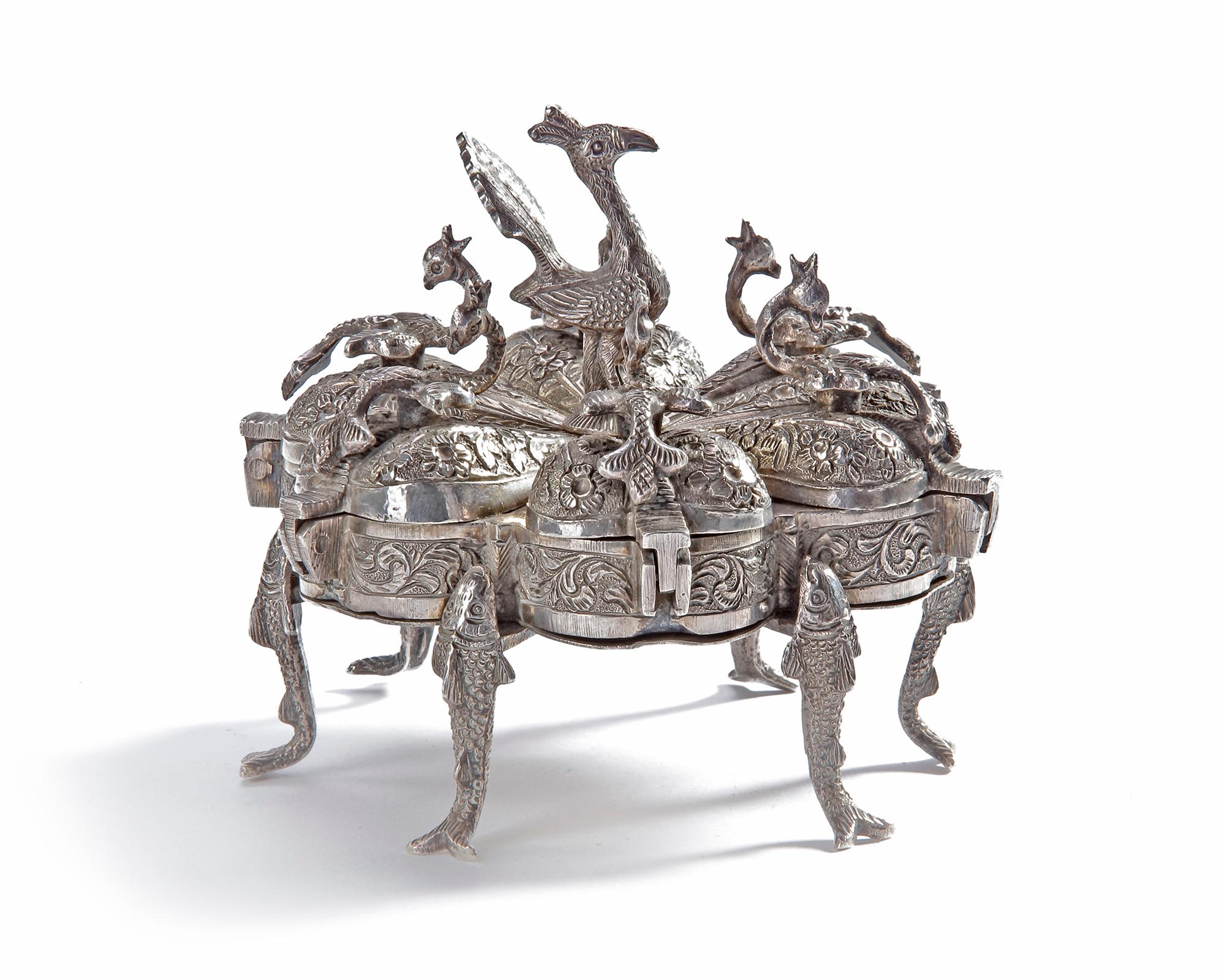Intricately engraved with rich floral motifs and adorned with finely detailed peacock figures in high relief, it captures both the grace and symbolism of India’s national bird. The circular box stands elegantly on six fish-shaped legs, each meticulously sculpted to enhance its sculptural beauty and balance. The lid, divided into multiple hinged compartments, reveals a clever and functional design, each petal-shaped section opening to form a flower-like arrangement when lifted.